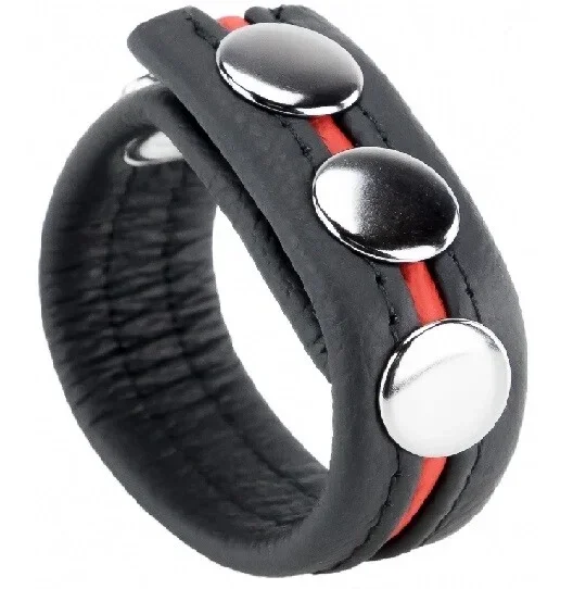 Ce cockring en cuir est proposé par la marque The Red. Il est conçu avec un cuir noir et une ligne rouge centrale.